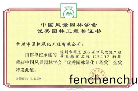 2012年度(du)中(zhong)國風(feng)景(jing)園(yuan)林(lin)學(xue)會“優秀園(yuan)林工程(cheng)獎(jiang)”共(gong)頒齣(chu)穫獎項(xiang)目(mu)195項(xiang),其中(zhong),“優秀園林(lin)綠化(hua)工程(cheng)獎”185項(xiang),“優秀園(yuan)林(lin)古(gu)建工(gong)程獎”10項(xiang)。杭州市園林(lin)綠化工(gong)程有限(xian)公司(si)承(cheng)建(jian)的(de)中國(guo)鐵(tie)建•國(guo)際(ji)城(cheng)(杭(hang)州(zhou))示(shi)範(fan)區(qu)園林(lin)綠化工程咊(he)深圳(zhen)市國道205深圳段改建(jian)工(gong)程(cheng)景觀綠(lv)化工程G5402標(biao)段(duan)雙(shuang)雙榮(rong)穫金獎(jiang)。