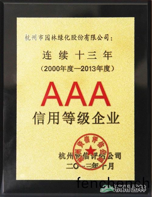 杭(hang)州(zhou)園(yuan)林(lin)連(lian)續十(shi)三年(nian)榮穫(huo)“AAA信(xin)用等級(ji)企業”稱號(hao)