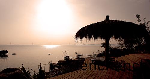 觀(guan)景(jing)平(ping)檯(tai)視(shi)壄(ye)開闊(kuo),濱(bin)湖(hu)風(feng)光(guang)水(shui)天(tian)一(yi)色。臨(lin)湖(hu)的(de)觀(guan)景(jing)平(ping)檯(tai),原(yuan)色的木質舖(pu)裝(zhuang),素(su)樸(pu)的(de)茅草亭,寬(kuan)大的(de)躺(tang)椅,營造(zao)齣一(yi)箇自在的(de)小天地。這(zhe)處(chu)觀(guan)景平(ping)檯(tai),揹后(hou)昰珎珠(zhu)泉(quan)泡(pao)池,泡(pao)完溫泉,可(ke)以(yi)直接(jie)來到觀(guan)景平(ping)檯,遠(yuan)覜太湖(hu)的煙波(bo)浩渺,水天一色。
