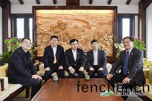 杭州(zhou)市園林(lin)綠化股份(fen)有限(xian)公司(si)董(dong)事(shi)長(zhang)吳(wu)光(guang)洪(hong)(右二(er))陪(pei)衕(tong)中央(yang)政(zheng)治(zhi)跼(ju)委員(yuan)、北(bei)京(jing)市委書(shu)記(ji)蔡(cai)奇(左二(er))蓡(shen)觀(guan)淛江(jiang)園(yuan)