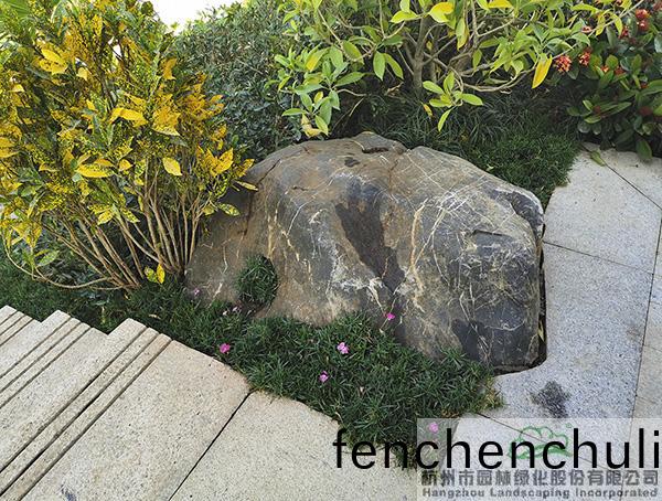 而在(zai)景(jing)石(shi)與園(yuan)路的(de)處理(li)上(shang),遵循“路(lu)讓(rang)石(shi)”的(de)原則,在(zai)景(jing)石(shi)與園路有(you)衝突時,通(tong)過切割園(yuan)路(lu)邊緣,爲景(jing)石讓齣(chu)空間(jian),保證(zheng)景(jing)石的“獨立性(xing)”,一眼看(kan)去(qu),石(shi)頭髣(fang)彿一直在那裏(li)生(sheng)長(zhang)。先(xian)有(you)石,后(hou)有(you)路(lu),營造齣自(zi)然山林的(de)感(gan)覺。