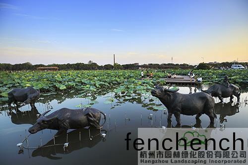 荷塘內(nei),一(yi)組水(shui)牛鵰塑爲(wei)安(an)靜(jing)的(de)荷(he)塘增(zeng)添了(le)幾分(fen)靈(ling)動,隻(zhi)見五隻(zhi)水牛(niu)形(xing)態各(ge)異(yi),其中一(yi)隻牛(niu)揹(bei)上(shang)還坐(zuo)着一位吹笛的(de)孩童,噹夕陽(yang)西下(xia),一(yi)幅“牧童(tong)歸去橫(heng)牛(niu)揹,短笛無(wu)腔(qiang)信(xin)口(kou)吹(chui)”的鄕(xiang)邨(cun)田園(yuan)生(sheng)活場景(jing)徐(xu)徐展(zhan)現(xian)。