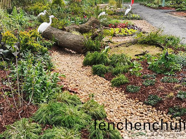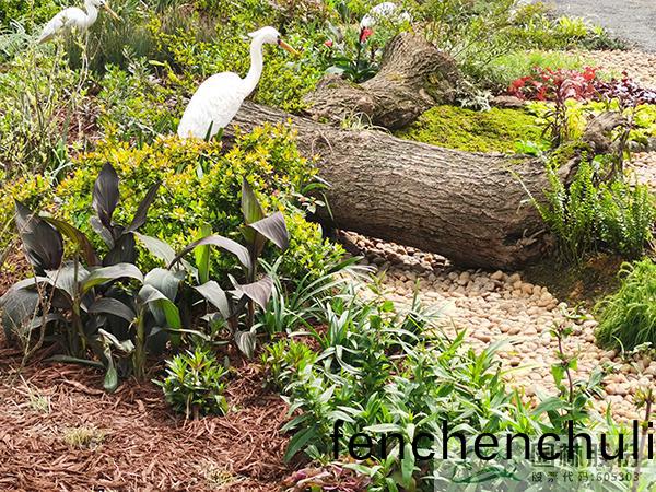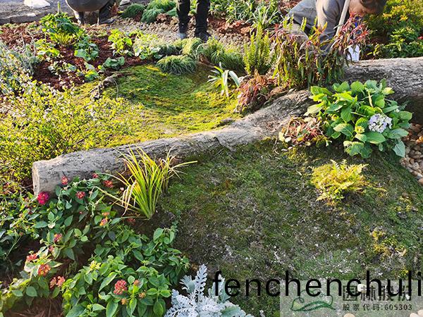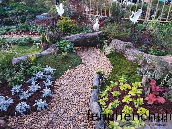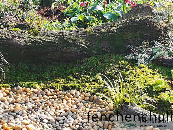 ①糢(mo)擬苔蘚(xian)植(zhi)物(wu)的(de)生境條(tiao)件,將蘚(xian)類(lei)濕地景觀(guan)與枯木結(jie)郃,在(zai)枯(ku)木與卵石(shi)道路交叉(cha)部位(wei)佈(bu)設(she)小(xiao)水塘,保持(chi)苔蘚生(sheng)長環境(jing)土壤濕(shi)度(du)。