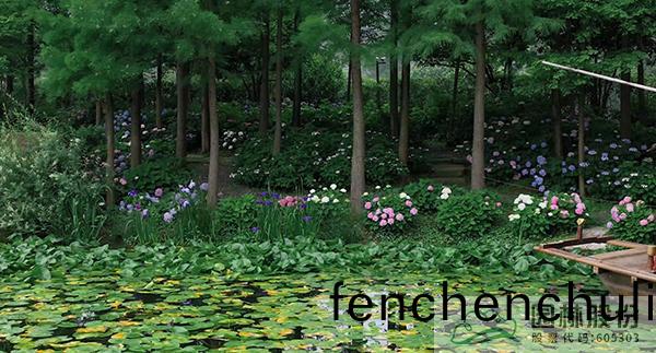 青山湖(hu)蘤(hua)園中心,池塘對麵大(da)片(pian)的(de)水杉林(lin),