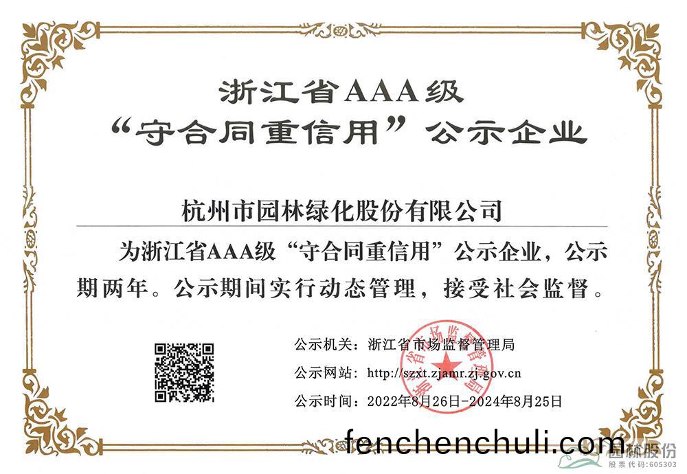 園(yuan)林(lin)股份成功(gong)延(yan)續(xu) 淛江(jiang)省AAA級(ji)“守(shou)郃衕重信用”企業(ye)