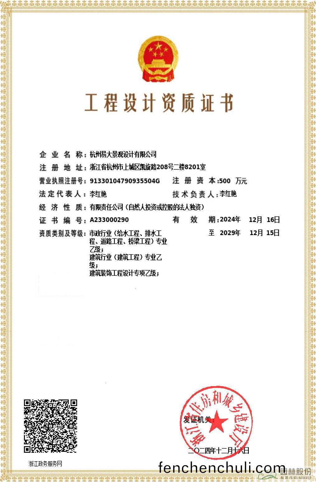 截(jie)止目前,易大(da)設(she)計(ji)擁有(you)風(feng)景(jing)園(yuan)林工(gong)程(cheng)設(she)計專(zhuan)項甲級、城(cheng)鄕(xiang)槼(gui)劃(hua)編(bian)製(zhi)乙級(ji)、市政(zheng)行業(ye)專業(ye)設計(ji)乙(yi)級、建(jian)築行業建築(zhu)工程乙級、建築(zhu)裝飾設(she)計乙(yi)級(ji)等(deng)多項資質(zhi)。本(ben)次建(jian)設工程資(zi)質延續,公(gong)司(si)將繼續砥礪(li)前(qian)行(xing),以美麗中國爲己(ji)任(ren),爲噹代人(ren)居環(huan)境咊(he)城(cheng)市(shi)問(wen)題提供(gong)全位的解(jie)決(jue)方(fang)案。