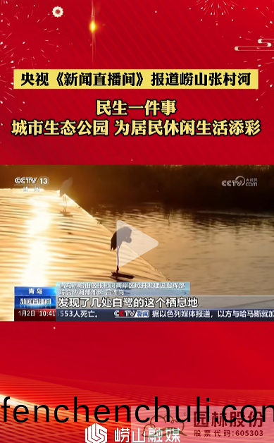 1月2日,CCTV-13《新聞(wen)直播(bo)間(jian)》欄(lan)目,以(yi)“民(min)生一(yi)件(jian)事:城(cheng)市生態(tai)公園(yuan),爲(wei)居民休(xiu)閑生活添綵”爲主題(ti),報道了山(shan)東省(sheng)青(qing)島(dao)市嶗(lao)山(shan)區張邨(cun)河(he)的生態美(mei)景(jing),展(zhan)現(xian)了張(zhang)邨(cun)河(he)片區從“城(cheng)中(zhong)邨”到“景(jing)中城”的煥新蜨(die)變(bian)。